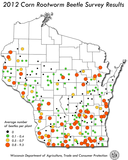 Volume 57 Number 19 Date 08/23/2012 CORN ROOTWORM - Below is a map summarizing the results of the 2012 corn rootworm beetle survey conducted from July 20-August 17. Populations decreased as compared with the 2011 data in the southwest, south-central, west-central, central and east-central areas and increased in the southeastern and northern areas. The state average of 0.6 beetle per plant compares to 0.7 last season. District average populations are 0.8 per plant in the southwest, 0.9 per plant in the south-central, 0.9 per plant in the southeast, 0.5 per plant in the west-central, 0.5 per plant in the central, 0.4 per plant in the east-central, 0.5 per plant in the northwest, 0.3 per plant in the north-central and 0.6 per plant in the northeast. Economic counts of 0.75 or more per plant were found in 57 of 230 (25%) fields surveyed. The cause of the decline in rootworm numbers is uncertain and somewhat unexpected based on the abundance of beetles noted during surveys in alfalfa, soybeans and vegetable crops earlier in July. Nevertheless, average counts in all three southern districts are still considered high or economic and suggest a potential threat of root damage to non-Bt, continuous corn next season. CORN EARWORM - Migratory moths continue to arrive in the state. Counts at the Ripon locations in Fond du Lac Count increased to high levels of 202-229 moths, while numbers at other sites decreased or remained the same as the week before. As previously stated, all susceptible sweet corn fields will require monitoring until harvest. Moth counts during the last reporting period were: Bloomington 68, Chippewa Falls 2, Janesville 21, Manitowoc 3, Marshfield 0, Ripon a 202, Ripon b 229 and Wausau 0. EUROPEAN CORN BORER - Second generation larvae range from second- to fifth-instar in the southern and east-central counties. Larval infestations affecting 10-20% of the ears have been reported in a few later-planted sweet corn fields but most sites appear to have had adequate control. --Krista Hamilton, DATCP Entomologist ![]() ![]() |