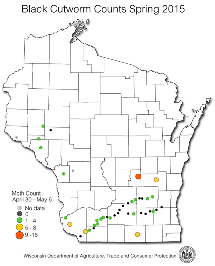 Volume 60 Number 3 Date 05/07/2015 BLACK CUTWORM - Moths arrived in moderate numbers this week. The DATCP network of 42 pheromone traps registered 75 migrants during the reporting period ending May 6, for a cumulative total of 117 moths to date. This week's capture of moths in 58% of the survey traps is indicative of a larger and more substantial flight, and signals that egg deposition has intensified on winter annual weeds such as common chickweed, peppergrass and yellow rocket in no-tillage and reduced tillage fields. Larvae resulting from the spring flight could begin cutting corn seedlings by May 20. EUROPEAN CORN BORER - Emergence of the first spring moths may start next week in advanced southern locations. Most overwintered larvae are in the pupal stage, which requires 10 days to complete at average daily temperatures of 65°F. Degree day accumulations near Beloit and La Crosse, currently the warmest locations in the state, are expected to surpass the 374 units (modified base 50°F) required for moth emergence by May 10. WIREWORM - This soil pest has been noted during surveys in the last two weeks and, like the black cutworm, can injure seedling corn this month. Untreated corn planted into fields formerly in alfalfa or pasture is most vulnerable to infestation. Damage should become evident shortly after emergence. In severe situations, or if wireworms have been a serious problem in the past, treatment may be necessary. -- Krista Hamilton, DATCP Entomologist ![]() ![]() ![]() ![]() ![]() ![]() |