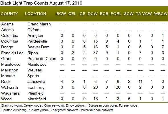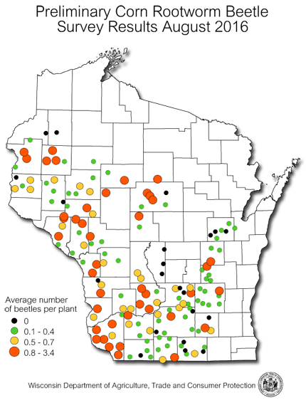 Volume 61 Number 16 Date 08/18/2016 CORN ROOTWORM - The map below summarizes the early findings of the 2016 corn rootworm beetle survey, completed in 155 of the expected 229 fields. Preliminary results show population increases in west-central and northwest Wisconsin and decreases in beetle abundance in the southwest and south-central regions. District averages thus far range from 0.4 beetle per plant in the south-central area to 0.7 per plant in the southwest. The state average as of August 17 is 0.6 beetle per plant. Economic populations of 0.75 or more beetles per plant have been recorded at 41 of the sites, or 26%. The highest average count of 3.4 beetles per plant was found north of Ripon in Fond du Lac County. The survey will be finalized next week. WESTERN BEAN CUTWORM - Larval infestations were observed this week in Adams, Chippewa, Dunn, Eau Claire, Juneau, Outagamie, Rock and St. Croix counties, where an estimated 1-7% of ear tips were infested with one or two larvae. Most of the caterpillars were in the intermediate instars and should enter the pre-pupal stage by before the end of the month. A few late moths are still appearing in black light traps, but the flight has effectively ended. Although the 2016 trapping survey documented the largest cumulative moth count in the last four years, this season's state total count of 1,528 moths in 75 traps (20 moths per trap average) ranks seventh in the 12-year history of western bean cutworm trapping surveys in Wisconsin. The record high count was 10,807 moths in 2010 (79 per trap) and the low was 521 moths in 2014 (five per trap). EUROPEAN CORN BORER - Second-generation larvae range from first- to fourth-instar in the southern and central counties. Larval infestations affecting 50-72% of the plants have been observed in a few later-planted corn fields, but most sites have lower populations involving less than 20% of plants. The treatment window for summer corn borers is expected to close statewide next week. Final management decisions for sweet corn must be made before the caterpillars have started boring into corn stalks and ears. CORN EARWORM - The early-August moth migration has resulted in minor infestations, mostly in western Wisconsin. Larvae ranging from ¾ -1½ inches were found this week in Eau Claire, Grant and Monroe counties, and egg laying is expected to intensify following the latest heavy moth flights. Sweet corn producers are strongly advised to continue monitoring traps and taking necessary treatment steps if warranted in the week ahead. Counts during the period of August 11-17 were: Arlington 421, Beaver Dam 30, Coon Valley 70, Cottage Grove 14, Hancock 0, Janesville 3, Madison airport 29, Marshfield 1, Mayville 92, Pardeeville 16, Prairie du Chien 3, Ripon 296, Sun Prairie 6, Sun Prairie North 13, and Watertown 0. -- Krista Hamilton, DATCP Entomologist