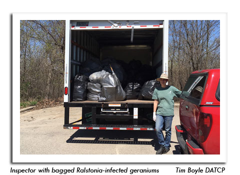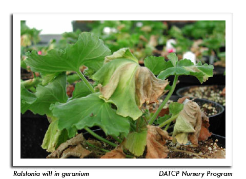 Volume 65 Number 2 Date 05/07/2020 RALSTONIA WILT IN GERANIUM - On April 19, officials with the USDA APHIS Plant Protection and Quarantine issued an Emergency Action Notification to a Michigan greenhouse after the pathogen Ralstonia solanacearum was confirmed in a Fantasia 'Pink Flare' geranium sample originating from a Guatemalan production facility. The notification immediately prohibited the sale or movement of all geraniums and other suspect plant material on the property, and resulted in a multistate trace-forward investigation to retrieve and destroy plant materials that had already been distributed, including over 2,450 plants destined for Wisconsin markets. Regulatory specialists from DATCP worked quickly with APHIS to assemble supply-chain information and inspect all Wisconsin greenhouses that received the geranium cuttings. Efforts by inspectors over the past 10 days have resulted in recovery and destruction of over 90% of the imported Fantasia 'Pink Flare' geraniums before they were sold, as well as other potentially infected plants. Ralstonia solanacearum is a usually-lethal bacterial pathogen that poses a serious agricultural threat to over 250 plants. The strain found in geranium (Race 3 biovar 2, or 'Rs R3bv2') is commonly referred to as 'Southern wilt,' and causes wilt diseases in several important crops including eggplant, pepper, potato and tomato. Greenhouses that received the Guatemalan geranium plants have been instructed to disinfect areas using APHIS-approved methods, and to monitor existing stock for wilting, yellowing, and other bacterial-wilt type symptoms. Vascular discoloration of the lower stem and root browning can occur in advanced stages. Growers and retailers with plants suspected of having Ralstonia wilt are asked to contact DATCP, their county UW-Extension agent, or the UW-Madison Plant Disease Diagnostics Clinic for assistance: https://pddc.wisc.edu/2020/05/01/ralstonia-wilt/. NR40 RESTRICTED INVASIVE PLANTS PHASE-OUT - The 5-year phase-out period for invasive trees and shrubs listed as 'Restricted' under Wisconsin's Ch. NR 40, Wis. Admin. Code or Invasive Species Rule in 2015, ended on May 1, 2020. The NR40 Rule makes it illegal to buy, sell, give away, or barter any species listed under this rule. This phase-out period was provided to allow Wisconsin nurseries who had newly NR40-listed trees and shrubs already in their inventory in 2015 to sell stock without penalty for a period of five years. After May 1, 2020, any plants on the NR40 phase-out list can no longer be bought into or sold out of a nursery's existing inventory. NR40 phase-out list plants that were not sold by May 1, 2020 must now be destroyed. DATCP is advising all nursery stock growers, retailers and consumers to review the complete list of invasive plants to ensure they are not buying or selling these plant species. (Note: several of the ornamentals do have exemptions for some of their cultivars, which allows for continued sale of those cultivars only.) To destroy remaining NR40 plants, double-bag both the plants and soil in garbage bags, tightly tie or seal the bags with zip-ties, label the bags "Invasive Plants," and landfill. Invasive species may also be burned, or buried beyond a minimum of 3 feet. DO NOT compost invasive material or put in cull piles. A summary of the Chapter NR40 Regulations for the Green Industry can be found on the Wisconsin DNR invasive species website. -- Tim Boyle, DATCP Nursery Inspector NEW UW PLANT DISEASE DIAGNOSTICS CLINIC LISTSERV - The UW-Madison Plant Disease Diagnostics Clinic (PDDC) provides expertise in diagnosing plant diseases, and information on plant diseases and their control to agricultural and horticultural producers and businesses, as well as home gardeners, throughout the state of Wisconsin. If you are interested in receiving regular updates on the educational materials and programs provided by the PDDC, please email Brian Hudelson at pddc@wisc.edu to have your email address added to the new clinic listserv, "UWPDDCLearn". This listserv will provide announcements of when new content is posted to the PDDC website ( https://pddc.wisc.edu/), including (but not limited to) new and revised University of Wisconsin Garden Facts/Farm Facts/Pest Alerts fact sheets, the Wisconsin Disease Almanac (a weekly summary of diagnoses made at the PDDC), monthly clinic web articles, and upcoming PDDC outreach programs. Similar updates and information are also offered via Facebook and Twitter @UWPDDC for anyone who prefers to receive information via these platforms. The PDDC is part of the Department of Plant Pathology in the College of Agricultural and Life Sciences at the University of Wisconsin-Madison, as well as the University of Wisconsin-Madison Division of Extension. -- Brian Hudelson, Plant Disease Diagnostic Clinic